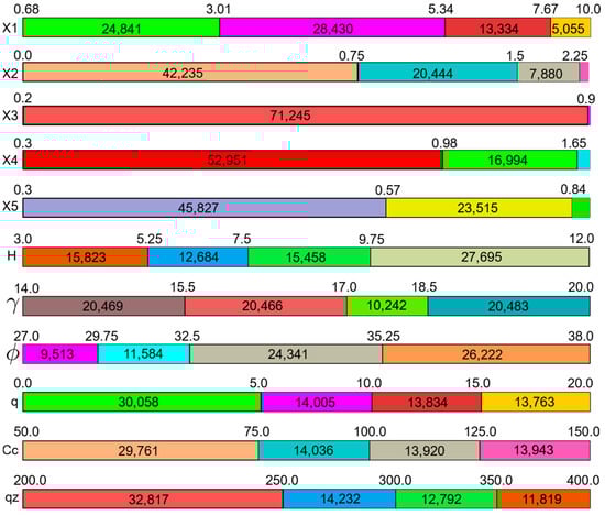 The database of optimum design combinations generated through the HS algorithm has been used in training predictive models. The design variables included in this dataset and their ranges are shown in Figure 2, where the values that each design variable takes are split into four different subgroups. For each one of these groups, the total number of samples belonging to that group is written inside the horizontal bars and the subgroup ranges are written above the subgroup boundaries. In Figure 2, the length of a subgroup indicates the percentage of the samples belonging to that group inside of the entire dataset.
