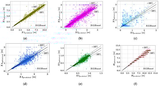 Comparison of the predicted and optimized dimensions using XGBoost. (a) X1, (b) X2, (c) X3, (d) X4, (e) X5, (f) H.