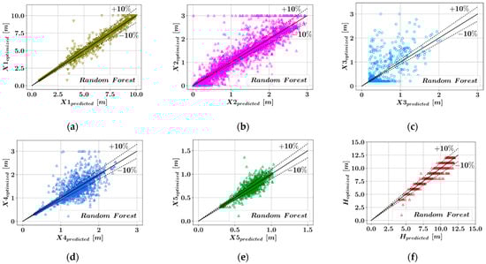 Comparison of the predicted and optimized dimensions using Random Forest. (a) X1, (b) X2, (c) X3, (d) X4, (e) X5, (f) H.