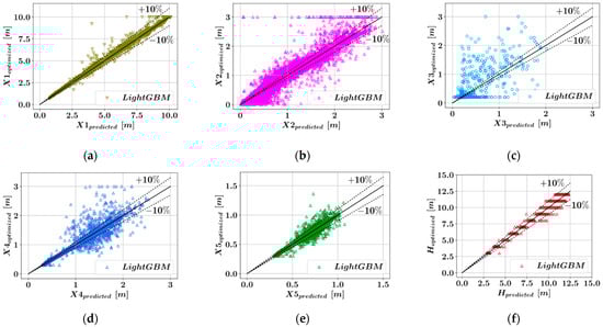 Comparison of the predicted and optimized dimensions using LightGBM. (a) X1, (b) X2, (c) X3, (d) X4, (e) X5, (f) H.