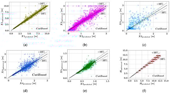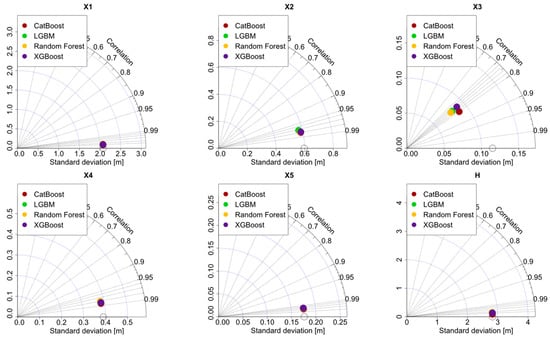 The Taylor diagrams in Figure 7 show the model quality by using the Pearson correlation coefficient as the metric of accuracy. The equation for the calculation of the Pearson correlation is given in Appendix A. The prediction of each model is shown with a circle and the corresponding correlation coefficient is shown on the radial grid, which ranges from 0 to 1. Furthermore, for each predictive model as well as the original dataset, the corresponding standard deviation values are calculated and shown on both the horizontal and vertical axes. From Figure 7, it can be seen that for the design variables X1, X5, and H, the correlation coefficients were greater than 0.99 for all predictive models, which indicates excellent accuracy of prediction. For X2 and X4, the correlation values were 0.98 for all predictive models. The lowest correlation values were observed for X3 in the interval from 0.75 to 0.80, where the highest correlation values could be obtained through the CatBoost model. A summary of the predictive model performance can be observed in Table 2, where the average values of the error metrics are listed for all the models. According to Table 2, the CatBoost models have the highest accuracy on average.