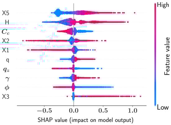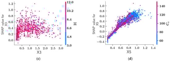 The feature dependence plots in Figure 9 present further information about the interdependencies of the different input variables. Figure 9a shows that as the value of X1 increases, the SHAP value decreases. Therefore, its impact on the model output tends to decrease. Particularly when the length of the toe (X2) has a high value, this relationship between X1 and its impact is more pronounced. From Figure 9b, it can be observed that up to a certain value as X2 increases, its SHAP value increases regardless of the value of X5, which is the variable most dependent on X2. For X2 > 1.5, the impact of these variables decreases with its size when X5 has higher values shown with the shades of red. The relationship between the values of X5 and the impact of this variable on the model output can be observed in Figure 9d. For X5 < 1, the value of X5 and its impact are linearly proportional regardless of the value of , which is the most dependent parameter on X5.