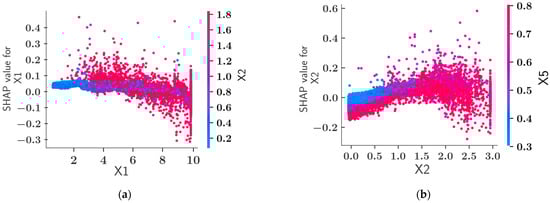 The SHAP summary plots and feature dependence plots presented in this section provide an effective way of visualizing the impact of various design variables on the overall predictions of the machine learning models. The summary plot shown in Figure 8 is an information-rich representation of how ten different input variables affected the CatBoost model outcome for the prediction of the wall stem thickness at the bottom (X4). In Figure 8, each dot corresponds to a different sample in the database. The dot positions along the horizontal axis are related to the SHAP value of the variable such that greater positive values indicate an increasing effect on the model prediction and negative SHAP values indicate a decreasing effect on the model output. Furthermore, the magnitude of a variable in a sample is represented with color such that greater magnitudes are shown with the shades of blue and lower values are shown with the shades of red. According to Figure 8, the thickness of the wall foundation (X5) has the greatest impact on X4 such that increasing the X5 value also increases X4.
