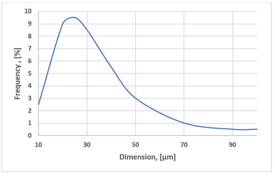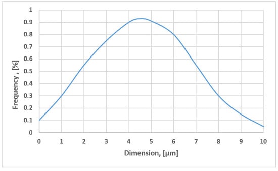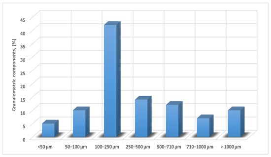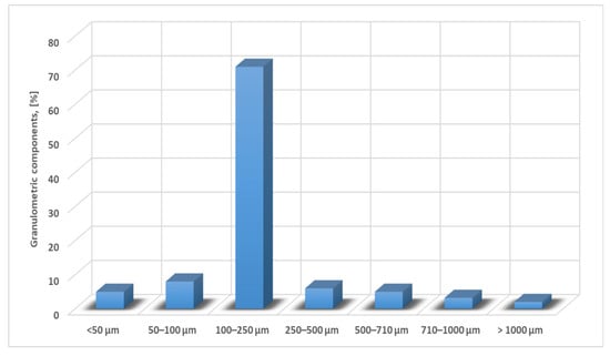 The sludge mill scale samples were taken from a steel plant, which were analyzed for the determination of the quality characteristics (the chemical composition was determined on the ARL 9400 XRF spectrometer—Thermo Fisher Scientific, Waltham, MA, USA). The data on the chemical analysis of the sludge mill scale under analysis are presented in Table 2 and the particle size distribution of the samples is shown in Figure 5.