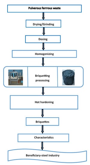In the context of sustainable development, the resource efficiency, reuse, and recycling of the steel in question of ferrous waste is very important for the steel industry. The efficiency and quality of raw materials and auxiliary materials is an integral part of the steelmaking process [1]. The transition from the linear economy to the circular economy requires action at all stages of the manufacture of ferrous alloys: from the extraction and transport of raw materials to the design of materials and products according to the new market requirements, to the production, distribution, and consumption of steel products, to their recycling and to the integrated management of the resulting waste, but also the recovery of the elements still useful from them. The steel industry must use all raw materials to their full potential, tending to zero waste in steelmaking [2,3]. Each co-product formed during the manufacture of steel, in the context of the circular economy, must be used in new products. This approach minimizes the amount of waste sent to landfills, reduces emissions, and preserves raw materials [2,4]. Co-products resulting from the steel industry (dusts, slurries, slag, milling) are recycled and transformed into new products for the industry. For example, 97% is recovered from the total amount of slag (BOF slag, EAF slag) produced (78% is used for cement manufacturing, 21% in road construction and the rest in agriculture as fertilizer) [3,5]. Powdery ferrous waste comes from the various operations of cleaning exhaust gases and wastewater, in dry or sludge form. Given the granulation of the dusts captured when cleaning gases, their storage raises special problems regarding the protection of the environment, so that almost all the steel companies that own such waste are looking for solutions to reintroduce them into the steel circuit [6,7,8].