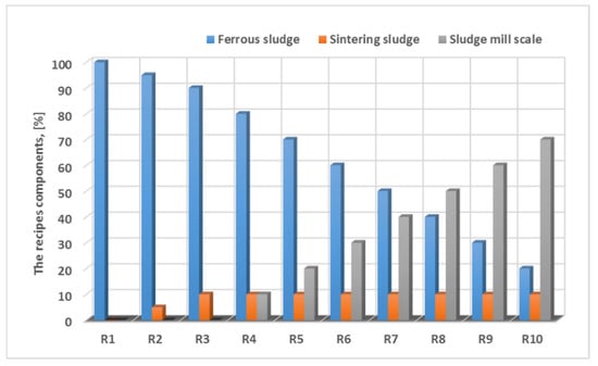 The composition of the recipes can be determined based on the availability of small and powdery waste and the destination of the processed material: steelworks. By using a mathematical modeling with generic algorithms, optimal ranges of variation of the briquetting recipe components can be obtained (in the case of the three types of waste with the average composition presented in the paper: 33–37% sludge mill scale, 3–10% sintered sludge, 55–62% ferrous sludge).