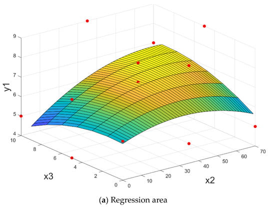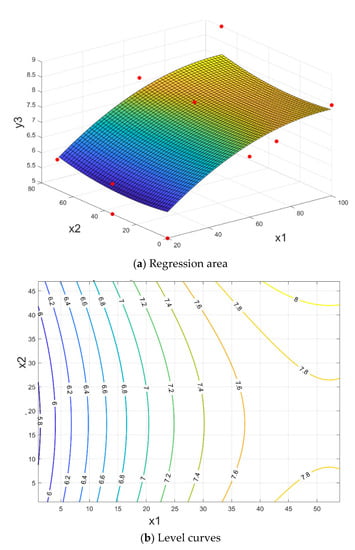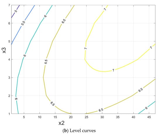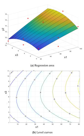 The results of the optimization problem (11) are shown in Table 6. The response area (14) and contour lines are shown in Figure 15 for the average value of parameter x3.