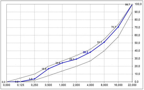 The tests were carried out with the use of two types of cements according to PN-EN 197-1 [46], cement CEM I 42.5 R-NA and CEM III/A 42.5 HSR-NA, granite aggregate 2/8, 8/16 and 16/22, density 2.65 g/cm3 and water absorption 0.80% and natural sand with a fraction of 0/2 with a density of 2.64 g/cm3. Two types of chemical admixtures were used in the form of a high-performance/strong admixture reducing water SP of the 3rd generation, in accordance with the PN-EN 934-1 [47] and PN-EN 934-2 [48] standards, a modified high-performance polycarboxylic admixture reducing liquid water with a density of 1.02 g/cm3 and an aerator with a density of 1.01 g/cm3 and water in accordance with the requirements of PN-EN 1008 [49]. The properties and design of the cements supplied by the manufacturer are shown in Table 1 and Figure 1.