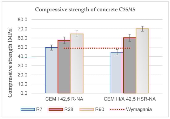 The effect of the type of cement on the compressive strength was determined according to PN-EN 12390-3 after 7, 28 and 90 days of maturation. The production and storage of 36 samples during the maturation period was carried out in accordance with the requirements of EN 12390-2. The average results of the obtained tests are summarized in Table 6 and Figure 3: