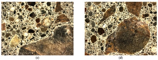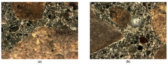 The characteristics of air voids in hardened concrete were determined in accordance with EN 480-11: 2008. Test specimens with dimensions of 150 × 100 × 20 mm were cut from cubes with a side length of 150 mm formed in the laboratory. The void characteristics were measured by the microscopic method using a computer system for automatic image analysis, Nikon SMZ1270 Navitar. Two samples of each tested concrete were selected for testing the properties of air voids. The image of the hardened concrete structure is shown in Figure 4.