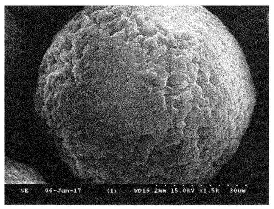 An interesting method for producing a spherical silicon nitride powder was proposed by Wu et al. [72]. This method involves mixing source materials, spray drying, carbonization, carbothermal reduction, nitridation, and carbon removal to produce a spherical silicon nitride powder with superior characteristics. The spray granulation process is adopted to carry out the atomization process of a silicon dioxide and carbon source mixed slurry to produce a dry spherical powder. This method has the advantage of directly controlling the powder diameter within the range of 40–50 μm. The authors suggested to use as the carbon source one component of the following components: glucose, sucrose, phenol formaldehyde resin; and use as solvent deionized water or ethanol. Moreover, through changing the parameters of rising temperature curve, it is possible to complete the process of carbonization, carbothermal reduction and nitridation at the same time, for producing a spherical silicon nitride powder with high purity. Figure 3 shows the obtained powder are spherical with an average diameter of 45.36 μm. Next, the authors of the patent calcinated the obtained powder at 800 °C in a nitrogen atmosphere for 2 h, and then at 1450 °C in a nitrogen atmosphere for 5 h. The granules processed in this way are shown in Figure 4.