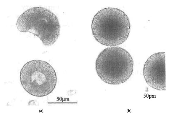 Comparison of granule structure. Dispersion state of spray-dry slurry was varied by controlling pH of slurry. (a) dispersed (pH = 10.8) and (b) flocculated (pH = 7.9). Reprinted from [66].