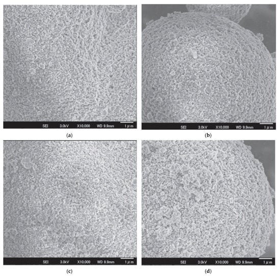 Surface structures of granules spray-dried from Si3N4-Y2O3-Al2O3-AlN-TiO2/toluene slurries stabilized with PEI-OA ((a) 1.00 mg/m3, (b) 1.30 mg/m3, (c) 1.55 mg/m3 and PEI-ISA, (d) 0.80 mg/m3). Reprinted from [61].