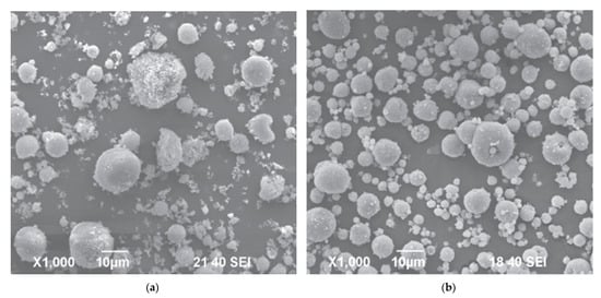 In the work of Takahashi et al. [66], the degree of dispersion of the suspension was controlled by changing the pH. Knowing the pH value of the isoelectric point and the ξ-potential of the surface of Si3N4, A12O3, and Y2O3, the authors found that the electrostatic repulsion between the negatively charged regions of the surface of the suspension components ensures good dispersion in the region of pH 10.8. On the contrary, at pH 7.8, the electrostatic repulsion between particles is weak, which leads to their flocculation. The former approach resulted in particles with an irregular shape unlike spherical and uniform ones obtained from flocculated suspension (pH = 7.9). The granules obtained from a dispersed suspension (pH = 10.8) have an irregular shape, most of them have a notch (Figure 5a). Spray-dried granules from a flocculated suspension (pH = 7.9) are spherical and uniform (Figure 5b). The relatively dark appearance of the granules obtained from the flocculated suspension indicates the existence of pores in the granules, i.e., the presence of open structures [66,67].