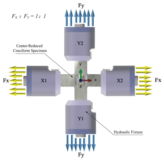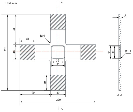 The centre-reduced cruciform specimen (Figure 1) was constructed according to the in-plane biaxial testing system (Figure 2). Primary cruciform specimen dimensions considered the clamping part, specimen geometry, and centre-reduced area of the specimen. The clamping part has the dimensions of a clamping length of 40 mm, a clamping width of 40 mm, and a clamping thickness of 6 mm; the cruciform specimen has the following six primary dimensions: the overall length is 220 mm, the overall width is 220 mm, the rounded corners are 10 mm, the thickness is 6 mm, and the lengths of cross-arms are 90 mm. The reduced area has two primary dimensions: the centre-reduced zone is a square with a side length of 35 mm, and a reduced thickness of 1.5 mm on each side.