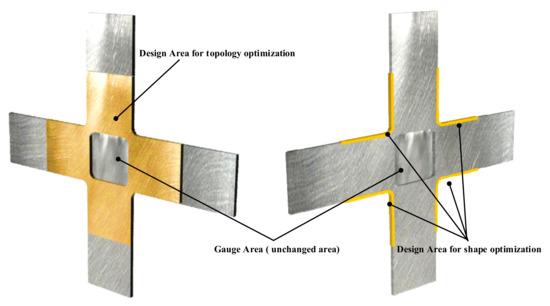 The position of the nodes in the design area can be fine-tuned using shape optimisation to improve stress uniformity in the gauge area. The clamping ends, the cross arms, the boundaries, and the gauge zone comprise the physical model of shape optimisation (Figure 7). The optimal results from the topology optimisation determine the geometry of the cross arms (Figure 7). The following are the three components of shape optimisation: the objective is to minimise the maximum von Mises stress within the optimisation region, the variable is the shape of the boundary, and the constraint is to maintain the volume of the optimisation region.