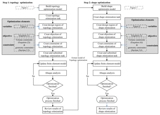 We developed the shape optimisation model based on the above finite element model (Figure 8). In Abaqus’ shape optimisation module, we specified an optimisation region, an objective, and a constraint to optimise. The design region consists of the nodes at the boundary of the optimisation region; the optimisation objective is to reduce the maximum Mises stress at the nodes of the optimisation region, and the optimisation constraint is the constant volume of the cross-arm. To prevent mesh distortion, the mesh co-ordinately deforms with the boundary. Other settings include: freezing the elements of clamping ends; and orienting the Z-axis in the direction of element removal.