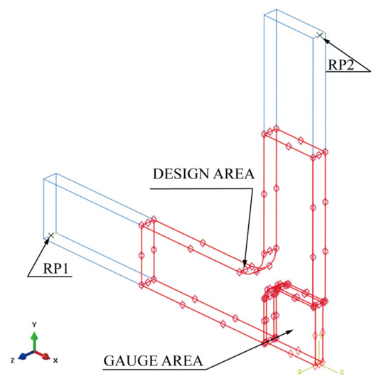 Topology optimisation could enhance stress uniformity in the gauge zone by redistributing the material on the cross arms. Figure 5 shows a physical topology optimisation model comprising the clamping ends, the design area, and the gauge zone. The clamping ends withstand loads of hydraulic fixtures.