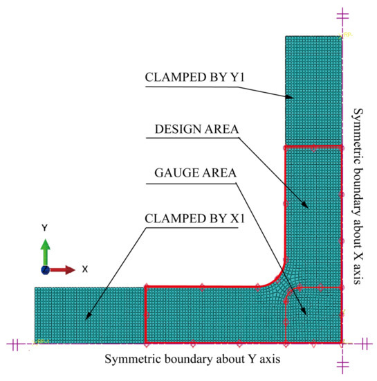 The stress distribution in the gauge zone of the cruciform specimen rests on the nature of load transfer [11]. Many cruciform specimen structures were classified into three distinct types [24]: (i) inner concave fillets at the intersection of cross-arms, (ii) slots on the cross-arms, and (iii) reduced regions in the centre. All three specimens have stress concentrations at the cross-arm intersection, preventing large-strain plane biaxial testing [12]. Different test purposes should have different optimisation objectives, and different optimisation objectives produce different optimisation outcomes. The difficulties encountered in the design of cruciform specimens led us to identify two common problems that influence the design of cruciform specimens: the boundary form at the intersection of the cross-arms and the material distribution on the cross-arms. Only optimising the geometric features of cruciform specimens cannot provide the optimal design, since the parameter varies without changing the geometric features’ nature of load transfer [25,26]. To optimise the nature of load transfer, non-parametric optimisations should be used in the design of cruciform specimens. However, the optimal distribution of materials on the cruciform arms, and the optimal boundary shape at the intersection of the cross-arms, remain unclear.