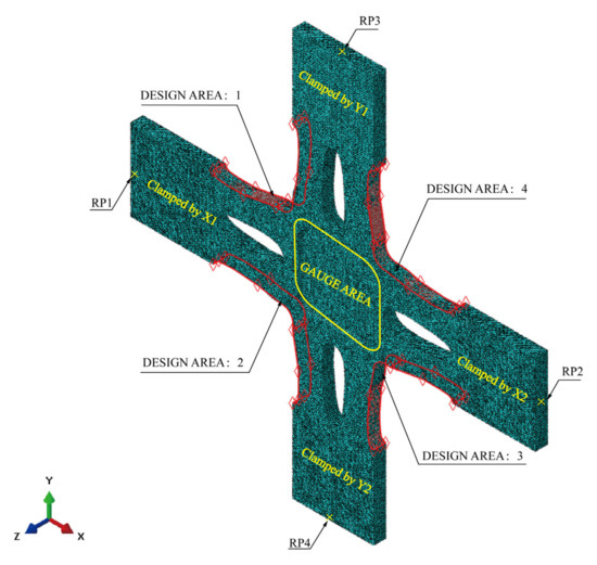 The specimen was optimised under equiaxial tensile conditions (Fx/Fy = 1). Four actuators (X1, X2, Y1, and Y2) perpendicularly stretched the original cruciform specimen (Figure 2). The clamping ends of the cruciform specimens resisted the distributed shear forces generated by the hydraulic fixtures used during equiaxial tensile tests. Throughout the topology and shape optimisation process, a constant loading and clamping force was applied to the clamping end of the cruciform specimen. Our strategy was to optimise the topology and shape of the specimen sequentially, ensuring that the optimised specimen results from topology and shape optimisation. The geometric model for shape optimisation was derived from topology optimisation.