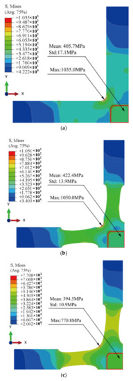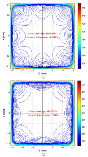 The topology-optimised specimen has the lowest standard deviation (5.8 MPa) in the observation area, followed by the sample optimised by topology combined with shape (6.8 MPa). The original specimen’s standard deviation (14.9 MPa) is greater than the two optimised specimens mentioned above.
