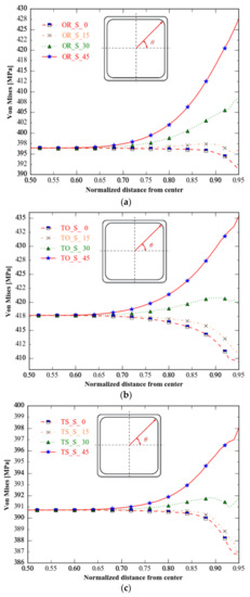 The von Mises distributions at 0–45° and 45–90° about the 45° axis through the origin are symmetric, so we calculate only the von Mises stress in the 0–45° direction.