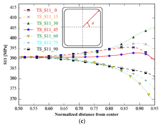 As the straight lines of S11 and S22 are symmetrical in the 45 degree direction across the origin under equiaxial tension, we sketch the stress distribution of S11 along 0°and 90° (Figure 15).