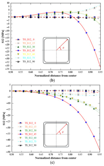 The topology-optimised specimen has the lowest stress range for S12, followed by the topology and shape-optimised specimen (Figure 16). Stress distributions in all directions for topology-optimised specimen S12 and topology optimisation combined with shape optimisation differ from those observed for the original specimen, particularly those in the 45 degree direction: S12 from the centre to the boundary, where the original specimen and the specimen of topology optimisation combined with shape optimisation decrease, whereas the specimen of topology optimisation increases first and then decreases, which makes the stress distribution of the specimen optimised for topology and shape similar to that of the original specimen in different directions, but the former exhibits more minor stress change than the latter.