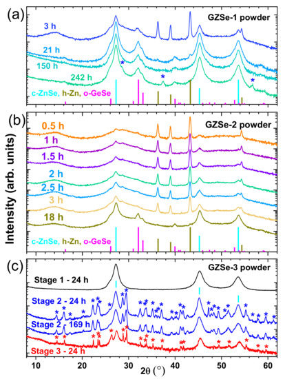 X-ray diffraction patterns of (a) GZSe-1, (b) GZSe-2, and (c) GZSe-3 powders taken at different milling times. The intensity is represented in logarithmic scale to make more visible the low intensity peaks, while the XRD patterns are expanded on the y-axis scale for clarity. The peaks of the unidentified phases are indicated with “*”.