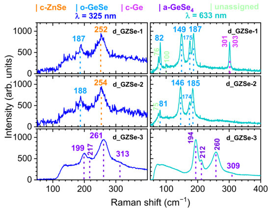 The micro-Raman spectra, recorded on the three mirror-polished chalcogenide bulk samples, are shown in Figure 5. The wavelength of the monochromatic incident light was 325 nm (3.815 eV, left) and 633 nm (1.959 eV, right), respectively. It was found that, at high laser power, there are changes of the irradiated area (photo-structural transformations that are specific to chalcogenide materials [18]), and, therefore, only the spectra at lower laser power with minimal influence on the samples, are shown. This is also the reason for the high noise in the spectra of d_GZSe-1 and d_GZSe-2, obtained at 325 nm.
