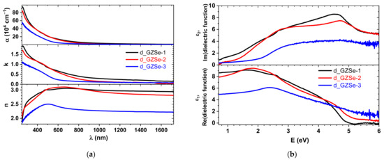 The optical properties of the three sintered bulk samples were analyzed using an ellipsometer in the wavelength range from 250 to 1750 nm. The refractive index (n), extinction coefficient (k) and absorption coefficient (α = 4πk/λ, λ is the wavelength) are presented in Figure 6a. The dielectric functions directly determined from ellipsometry are shown in Figure 6b. The sensitivity for very small extinction coefficients is lower for ellipsometry than in the case of conventional transmission spectroscopy [26], but due to sample properties (high electron density) and processing issues (porosity), conventional transmittance was not possible to be performed.
