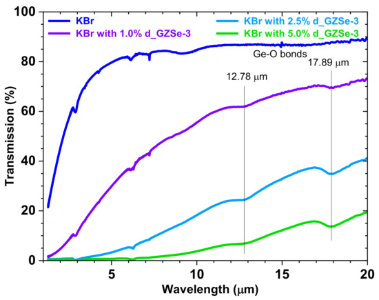 Attempts were made to measure the IR transmission of polished glass-ceramics discs, however, the non-parallel surfaces and the samples volume gave inaccurate values. Next, different weight concentrations (1.0, 2.5, and 5.0 wt. %) of the grinded d_GZSe-3 sample were measured in a KBr matrix. To avoid the effects due to mechanical attrition, the embedded particles are of several microns in size. They, therefore, light scattering is induced (in Figure 7, notice the increase of the transmittance for longer wavelengths), which reduces the transparency window. Two absorption bands are noticeable at 12.78 μm and 17.89 μm which are due to the oxidation of the chalcogenide particles surfaces [33]. Further research is required to assess in detail the optical IR properties (e.g., transmittance).