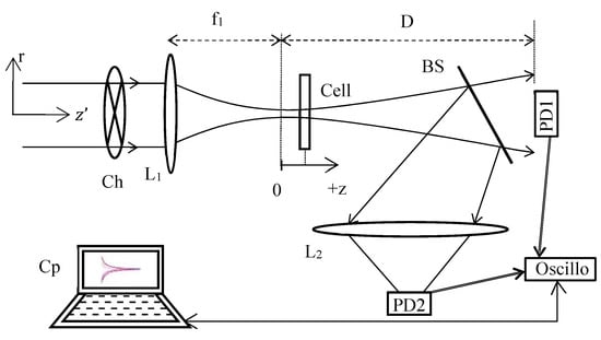 10]. Further, by using cw laser excitation, in which the power and the transverse mode profile are very stable, problems with incident power fluctuations are minimized when compared to that with pulsed lasers used in third-order nonlinear characterization. For each z position of the cell, the top clock is given by a PD integrated in the chopper Ch and connected to the oscilloscope to trigger the signal (the link is not shown in