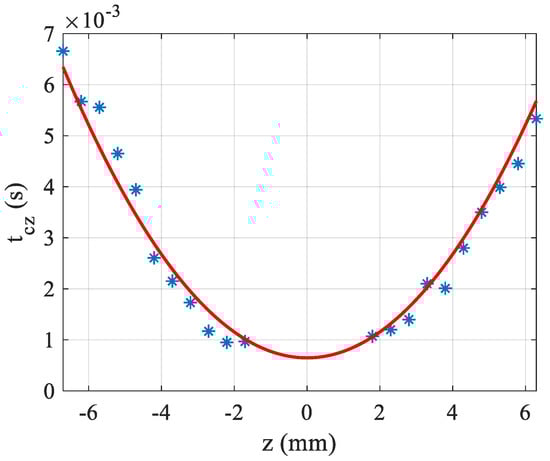 is plotted as a function of z where it can be seen that the variation of this time is parabolic as given theoretically by Equation (4). The fitting allows to determine