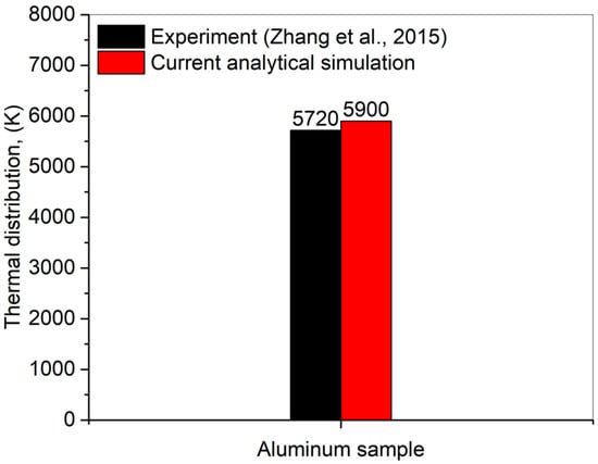 Thermal distribution for a single pulse comparison between the current analytical simulation model and experimental [23] results.