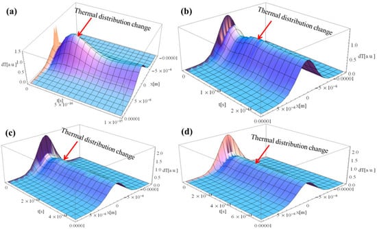 - Non-Fourier heat equations can show thermal wave propagation in laser–material interaction. Furthermore, it was identified that as the pulse duration increases, the change in the thermal distribution becomes insignificant due to an inverse correlation between the pulse duration and the total energy of the pulse;