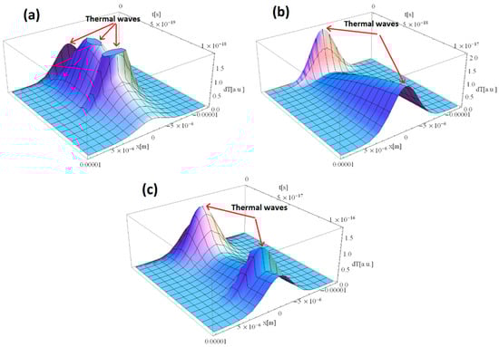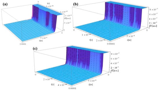 Figure 3a–c shows the thermal distribution within the Al sample in the case of 1, 10, and 100 as, respectively. As the laser–Al interaction time decreased from fs to as the number of thermal waves increases. While shifting from fs to as regime, the laser intensity is more powerful. It produces an explosion upon impact with the sample surface, as the optical energy cannot be converted into thermal or vibrational energy in the as time frame. The pulse, in return, generates a thermal wave with a higher magnitude compared to the fs regime. The explanation, provided for Figure 2 using Equation (12), applies also here: the higher the pulse duration, the lower the total energy of a pulse in FWHM. This behavior can be clearly observed while shifting from 1 to 10 as and 10 to 100 as. One can analyze the higher number of thermal waves in Figure 3a compared to Figure 3b,c. The summation of thermal waves in Figure 3a results in a higher peak magnitude than the rest of the presented graphics.