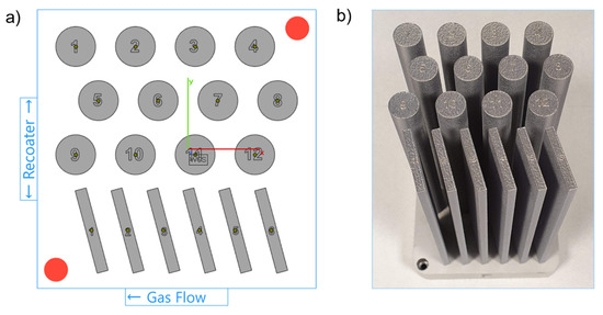 (a) LPBF process build job layout; (b) An exemplar build plate with samples manufactured.