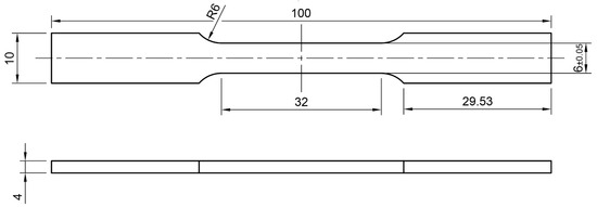 The static tensile samples are designed following ASTM E8/E8M-16a (room temperatures) [23]. Tensile tests are performed on the HC-25 ZwickRoell servohydraulic testing machine (ZwickRoell GmbH & Co. KG, Ulm, Germany) with a test frame using a ±25 kN load-cell. The tests are carried out with a strain rate of 0.0008 s−1 and are continued until the sample brake. Five specimens are used for each series (S0, S1, S2, S3, and S4).