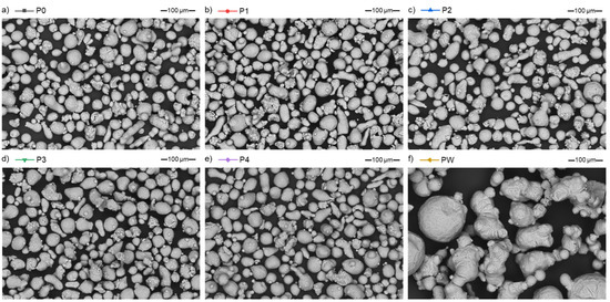 Microscopic images of the AlSi7Mg0.6 powders in various processing states, SEM/BSE: (a) virgin (P0); (b) after 1st LPBF process (P1); (c) after 2nd LPBF processes (P2); (d) after 3rd LPBF processes (P3); (e) after 4th LPBF processes (P4); and (f) waste (PW).