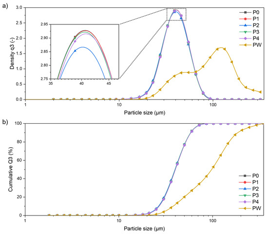 The obtained particle size distributions (PSD) for each evaluated powder are comparable. There is no significant difference between each consecutive sieving cycle (P0 to P4). The curves for powders P0–P4 are plotted simultaneously one on another, both for distribution density q3 (Figure 5a) and the cumulative density Q3 (Figure 5b), showing almost identical plots. The SEM observations and PSD analysis show the presence of satellite particles throughout the powder states with no variations. The values of x10,3, x50,3, and x90,3 characteristic particles size parameters are presented in Table 3. In the case of the PW probe, PSD curves are clearly visible and are moved to the right side, which means that the powder sample consists of much larger diameter particles. PW x50,3 is 2.5-times higher than P0–P4 and x90,3 is 3.5-times higher than P0–P4.