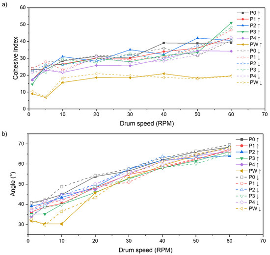 (a) The cohesion index for the AlSi7Mg0.6 powder in different processing states regarding the rotational speed measuring drum; (b) Mean avalanche angle values for the AlSi7Mg0.6 powders in various states with regards to the rotational speed of the measuring drum.