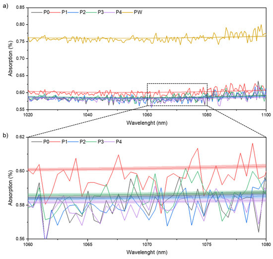 Laser light absorption for wavelengths from 1020 to 1110 nm of AlSi7Mg0.6 powder and polynomial curve fitting with 95% confidence interval (a) P0, P1, P2, P3, and P4 state and PW absorption for wavelength from 1020 to 1110 nm for (b) magnification for the wavelength from 1060 to 1080 nm and for P0, P1, P2, P3, and P4 states.