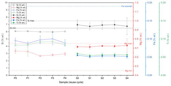 In order to determine the influence of the powder degradation on the functional properties of the samples obtained by the LPBF method, the chemical composition analysis using the XRF method was performed. Table 4 and Figure 8 show the analysis results for the bulk samples (S0 … S4) and the powders (P0 … P4).