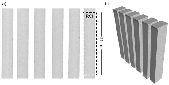 The quality of the as-built samples is evaluated using a technical computed tomography method. X-ray computed tomography (XCT) enables the reconstruction and evaluation of the external and internal structure of the manufactured samples, which is especially important for samples produced with additive technologies [24,25]. The volumetric models obtained as a result of the XCT reconstruction allow to determine the volume of voids or pores filled with incompletely melted powder (Vpor) and the volume of the melted powder (Vm), making it possible to determine the volumetric porosity (P) according to the Equation (1) [26]: