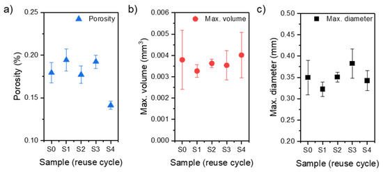 On the contrary, if results from [44] are considered, series S4 may be the critical point, after which some changes could appear. Even if all powder samples (P0–P4) and bulk specimens (S0–S4) show repeatable properties with changes within error limits, certain signs could indicate some initial degradation. A small decrease in dendrite arm space can be observed, a small change in chemical composition and a higher mean hardness. All the above-mentioned minor changes can be translated into the change of detected bulk samples’ porosity distribution. The pore count is approximately 30% lower for the S4 series than for the S0–S3 series.
