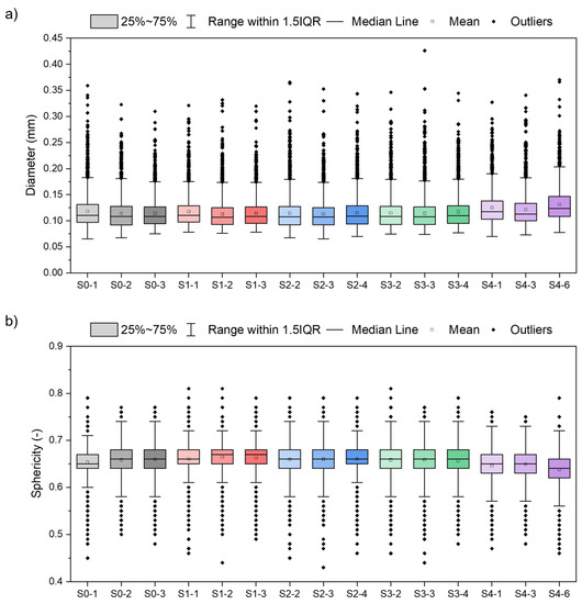 Box plots of pore diameter (a) and pore sphericity (b) based on CT data for three of the most porous samples of each series: S0 to S4; outliners qualified using the 1.5IQR method (IQR—interquartile range).
