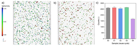 Pore reconstruction recorded for samples (a) S1-1 and (b) S4-6; (c) Pore count in ROI for each respective series (S0–S4)—histogram based on samples analysed in Figure 11 (error—95% confidence interval).