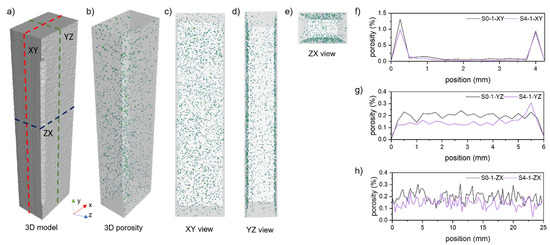 The samples’ pore distribution homogeneity was compared for the XZ, YZ, and ZX (Figure 13a–e) and samples S0-1 and S4-1. The porosity analysis was performed for sequential ROIs with heights equal to 0.25 mm [25]. The most significant changes in porosity were noted for the XY plane. It results from the presence of subsurface pores, which are a defect caused by the selected LPBF boundary process parameters and strategy. Hence, the porosity in this plane has the highest values, even up to 1.35% (Figure 13f). It is worth noting that this phenomenon does not occur in the other planes of the analysis due to the machining and ROI selection. Hence, the global values do not exceed 0.22%, as shown in Figure 13g,h.