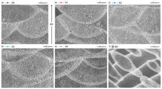 The microstructure of the samples is typical for the additively manufactured aluminium alloys and is characterized by a fine, columnar–dendritic structure. The CLSM (Figure 14) and SEM (Figure 15) microscopic images do not differ between each series. Figure 14a–e represent the XZ plane of specimens, and Figure 14f shows the XY plane of an S0 specimen to show the characteristic fusion lines and material texture in planes parallel (XZ) and perpendicular (XY) to the LPBF build direction (BD).